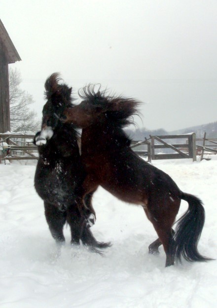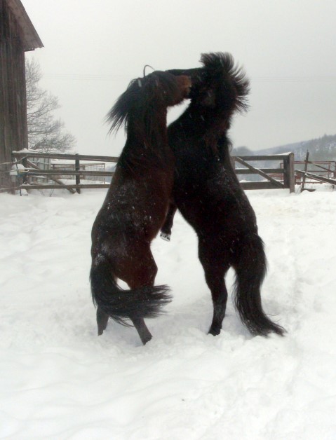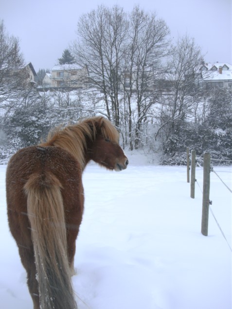 Lauffreudiger Fünfgänger mit den Schwerpunkten Tölt und Rennpaß sowie guten Proportionen und langem Behang, Begründung: Lukka ist eine kleine Stute, die genetisch gesehen sehr viel altes Fünfgänger Blut mit viel Rennpaß in sich führt (Nattfari ). Ihre Schwerpunkte sind der Tölt und der Rennpaß, dazu kommt ein hohes Maß an Lauffreude. Isaiah bringt neben einer starken lockeren Töltveranlagung noch einen guten Trab mit sowie einen hervorragenden Schrttt. Dazu hat er eine hohe Aufrichtung mit einem sehr schön zu formenden Hals und sehr weichem Genick, sowie ein starkes Fundament mit langen Beinen und sehr guten Proportionen. Lukka bringt trotz ihrer Größe ebenfalls gute Proportionen mit, ihr Beine könnten stärker sein, dem langen Hals fehlt die Aufrichtung und das weiche Genick. Die Überlegung hinter dieser Anpaarung war entweder die Grundgangarten der Stute zu verbessern oder die bereits vorhanden Schwerpunkte Tölt und Rennpaß noch zu verstärken. Wir haben uns für die letztere Variante entschieden, unter dem Wissen eines schlechten, aber bequemen Galopps. ;O) |